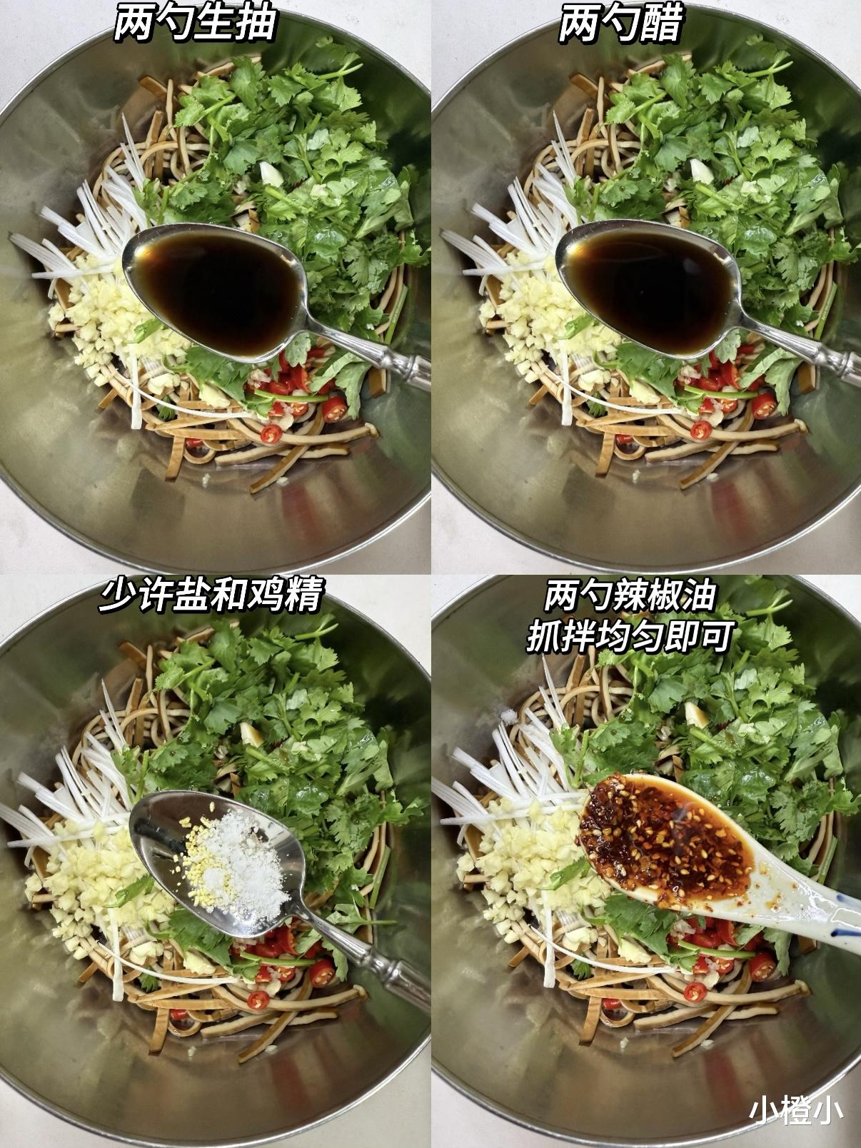 把豆干、蒜末、小米辣、葱丝、香菜梗先倒大碗,筷子从下往上翻拌10下,让空隙里先塞满小料;再淋酱汁,继续翻10下;最后放香菜叶和辣椒油,轻拌5下收工。动作要轻,防止豆干断成“豆渣”。