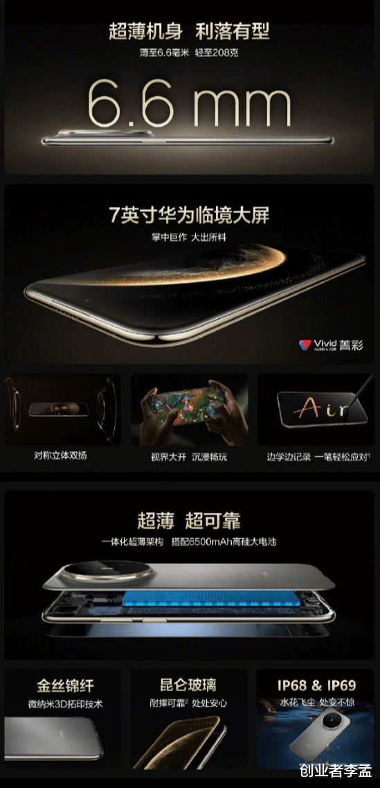 在各大手机厂商都在想办法卷到小屏的时候,华为开始做起来了大屏,7英寸的屏幕,手机很大所以可以在非常薄的机身下可以塞下6500毫安的大电池!支持66瓦的有线充电,不支持无线充!6.6mm机身里塞下7英寸大屏和6500mAh电池的"反套路"旗舰。也是非常特色机型。(相比iPhone的Ari,为了超薄机为厚度牺牲电池,苹果iPhone Air厚度5.6mm只配3149mAh电池)