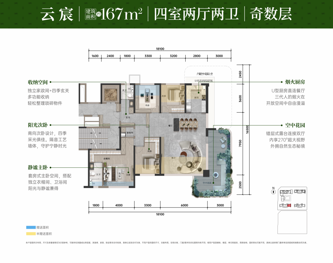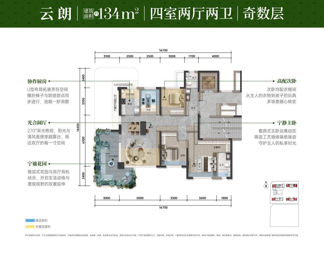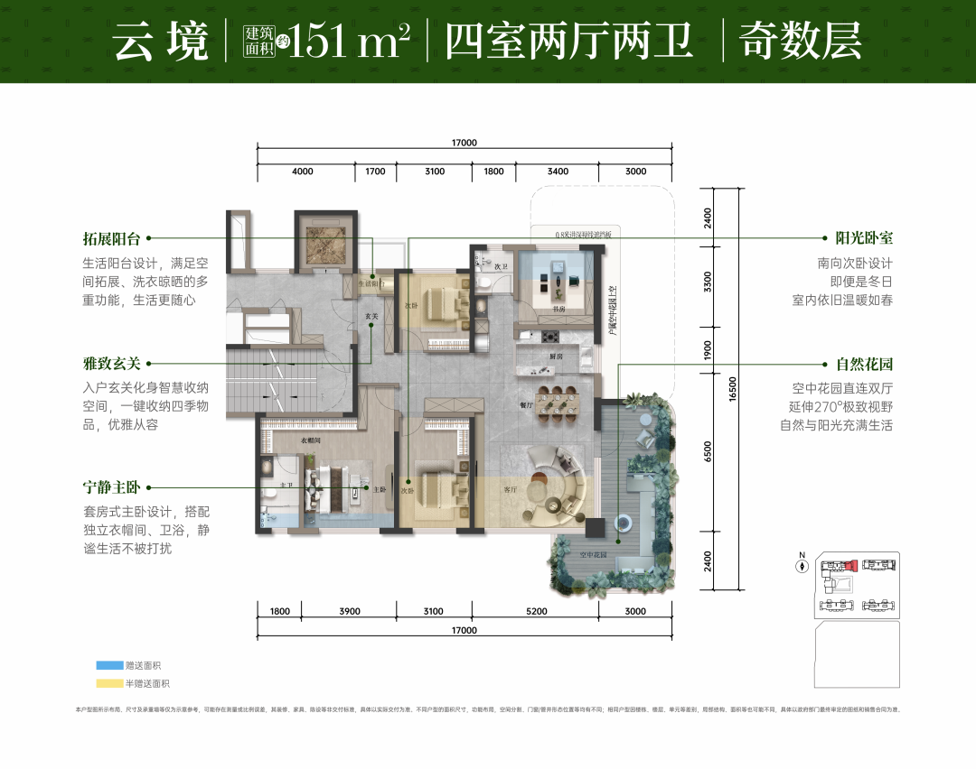 约151㎡户型,空中花园直连双厅,延伸270°极致视野,自然与阳光充满生活。再加上17米超大面宽尺度,实现了采光、瞰景的超级界面。搭配套房式主卧设计,独立衣帽间和卫浴,更为主人提供了私密、安静的休息空间。