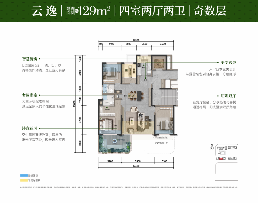 约129㎡户型面宽尺度达到了12.3米,空中花园直连卧室,清晨阳光与花香一同进入室内,营造出浪漫、舒适的居住氛围,增加了居住的情趣和自然体验。