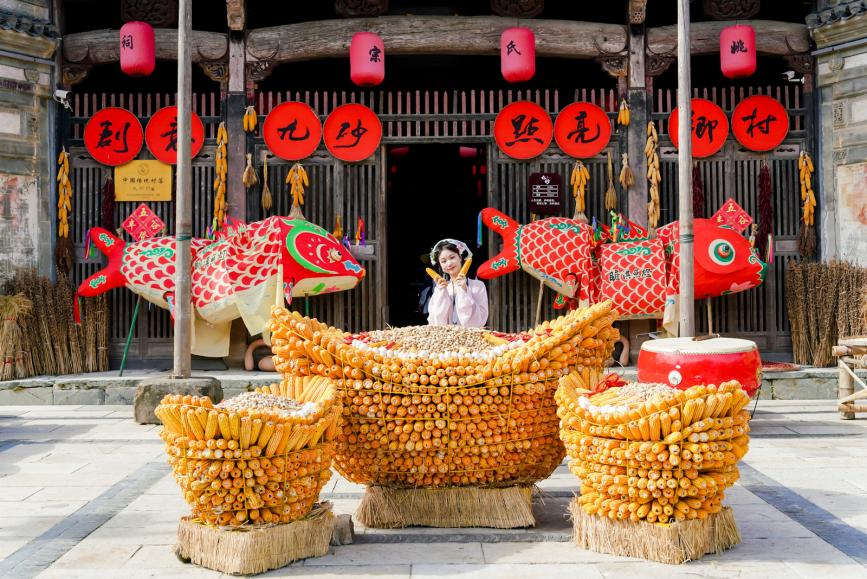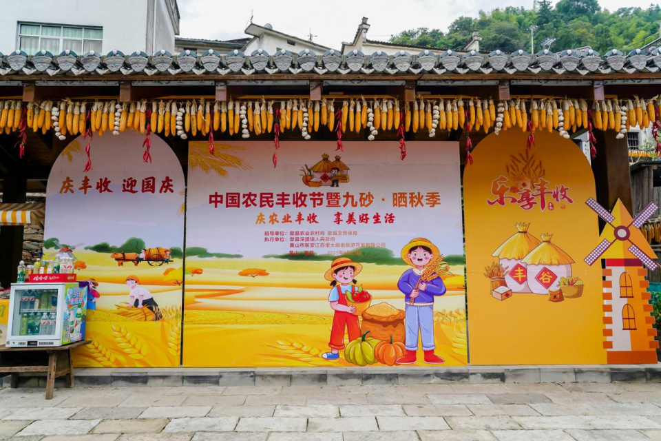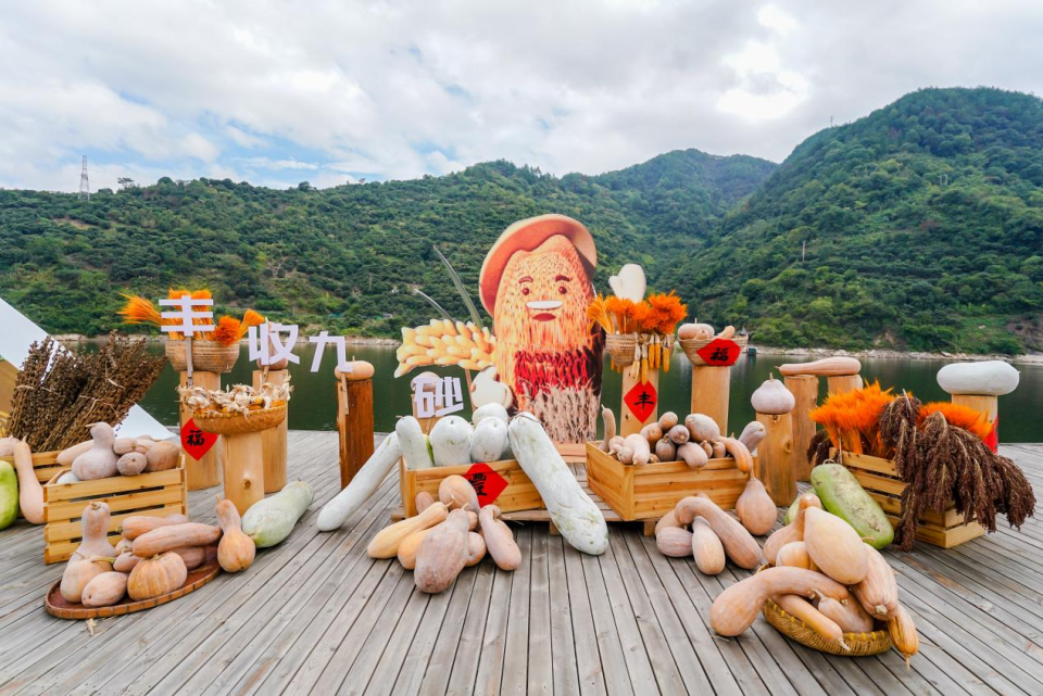色彩斑斓的谷物艺术装置、错落有致的立体晒架、装饰一新的临江渔船,将新安江畔的秋日丰收转化为可游可赏的立体画卷。游客既可沉浸于“五谷丰登”“丰收新安江”等大地艺术景观,也可参与“甘蔗榨汁坊”“瓜果满架”等互动体验,在趣味中感受徽州深厚的农耕文化与丰收喜悦。