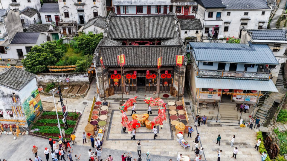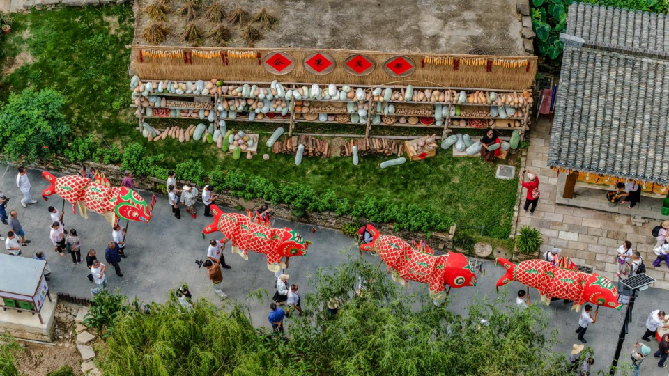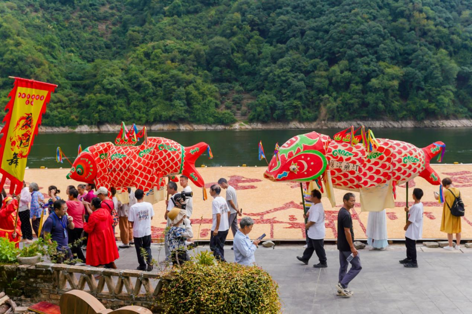 今年晒秋活动在延续“非遗民俗+大地艺术”传统的基础上,融入更多徽州民俗表演元素。歙县传统民俗——瞻淇鱼灯与定潭舞龙轮番登场,鱼灯游弋如江涛涌动,金龙翻腾似稻浪起伏,为丰收时节增添灵动祥瑞的色彩,生动传递徽州人民祈求丰年、团圆美满的文化愿景。