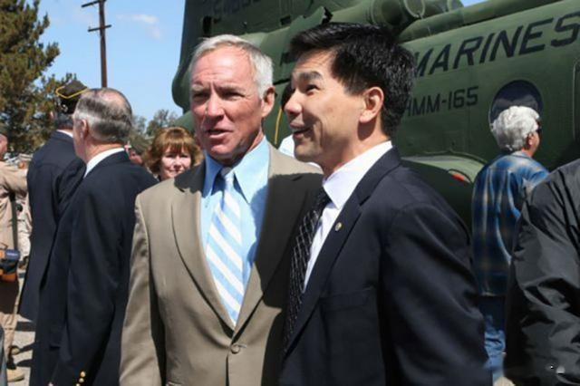 杰瑞·贝里与难民光范(Quang Pham)合影,光范在9岁时乘坐贝里的直升机从越南逃出,后来自己也成为了HMM-165的飞行员,两人于2010年4月30日在飞行陆战队员航空博物馆前站在CH-46直升机前。展台上展示了贝里在1975年撤离任务中驾驶的直升机。