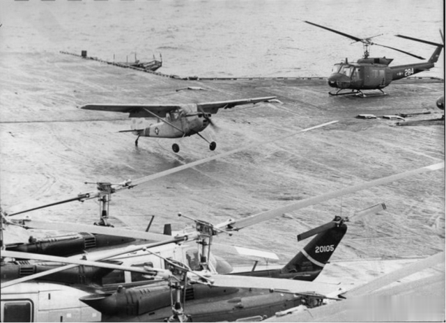 此时,南越傀儡政权的空军也驾驶小型飞机准备降落到美军航母上逃跑,大约有7000名南越人和美国人于4月29日和30日疯狂地挤上中途岛号。