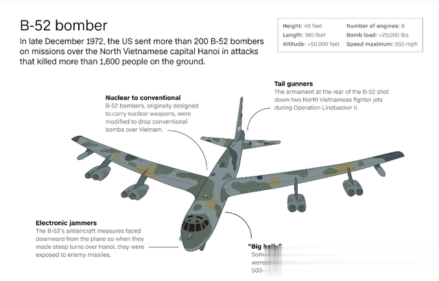 当时B-52轰炸机沿着预定航线成长列飞,在投放完炸弹后进行盘旋转弯回家——此时越军的电子干扰设备会朝向天空,这让B-52的迟钝,更容易受到攻击。