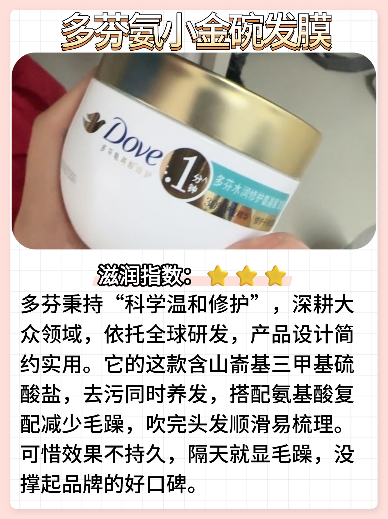 很多姐妹都在问,发膜到底有用吗,其实答案是肯定的,发膜主要是给头发补充营养和闭合毛鳞片,尤其针对干枯毛躁的头发,能明显改善粗糙感,很多人觉得用了没效果,其实是用法不对,正常情况下发膜只需要涂在发中和发尾,停留三五分钟再冲洗,不用涂到头皮上,也不用停留太久,不然反而容易让头发扁塌,不少人烫染之后头发像干草一样,摸起来扎手还容易打结,这时候单纯用护发素是不够的,发膜的滋养层次更深,能缓解毛躁和干枯感,坚持用下去头发会顺滑很多,也更容易梳理,平时在家自己护理,不用追求复杂步骤,简单涂抹冲洗就有效果,也不用天天用,一周两到三次就足够,过度使用反而会增加头发负担,下面是我整理的发膜使用和挑选干货,觉得有用可以先收藏。