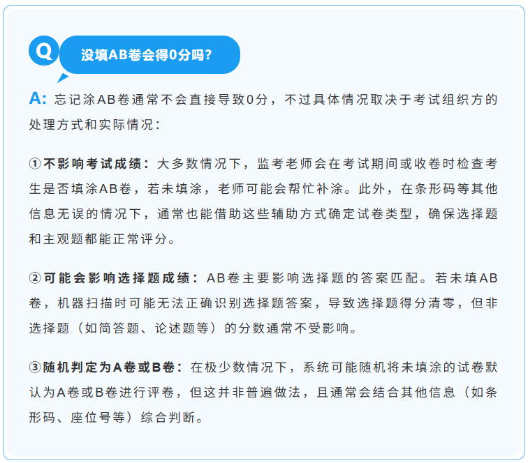 出于为考生考虑,如果你漏填AB卷导致选择题没有分数的话,我们会找出来,根据一定的规则判断你的试卷类型,再对你的试卷进行评分。
