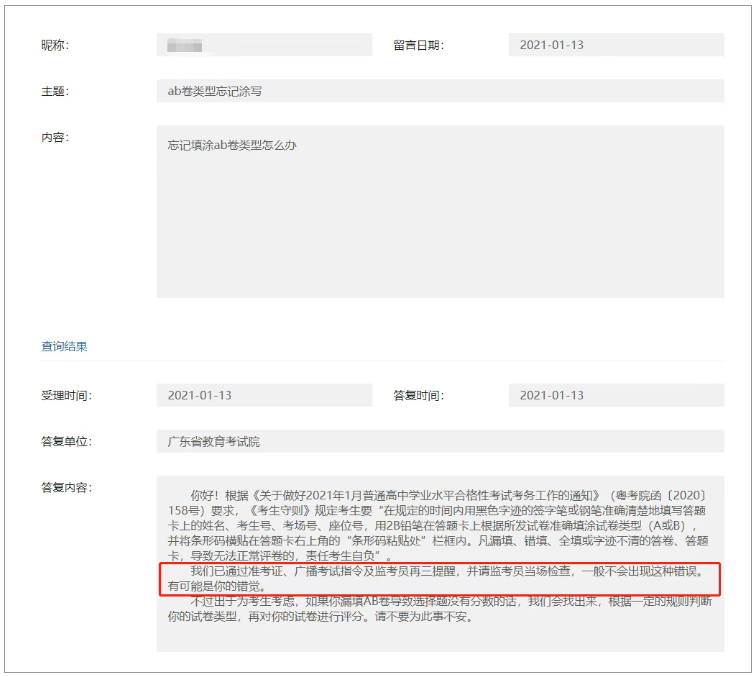 往年也曾有考生针对此问题咨询过广东省教育考试院,得到官方回复如下: