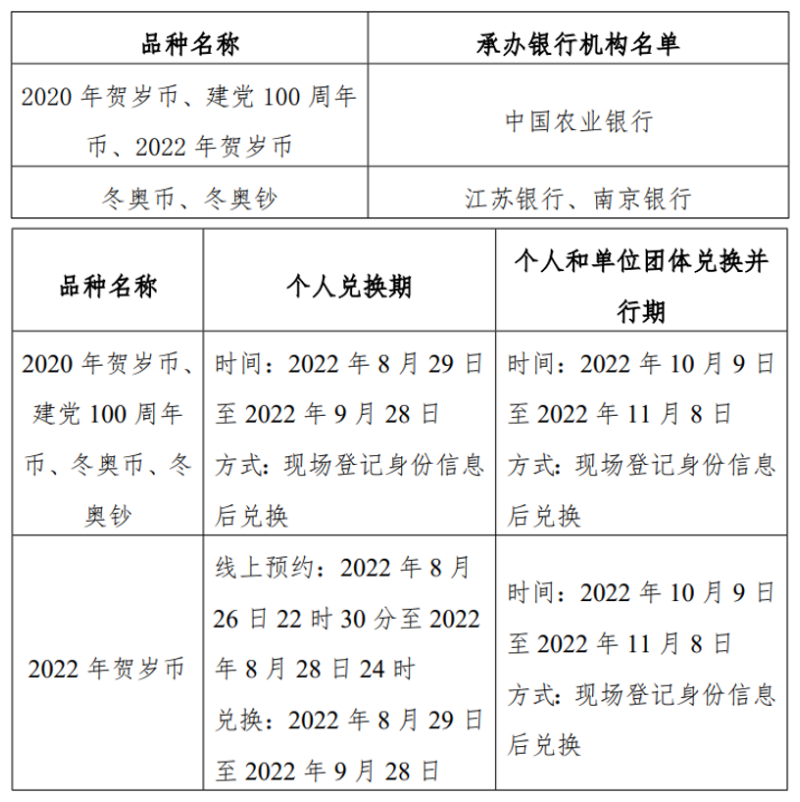 4、江苏省。江苏省同样也采用线上预约兑换与现场排队兑换相结合兑换模式,虎币线上预约,其余品种线下现场排队兑换。承办银行与其他省份有所区别,除了鼠币、建党100周年币、虎币只有一家银行承办,而冬奥币钞则是由两家本省银行承办。