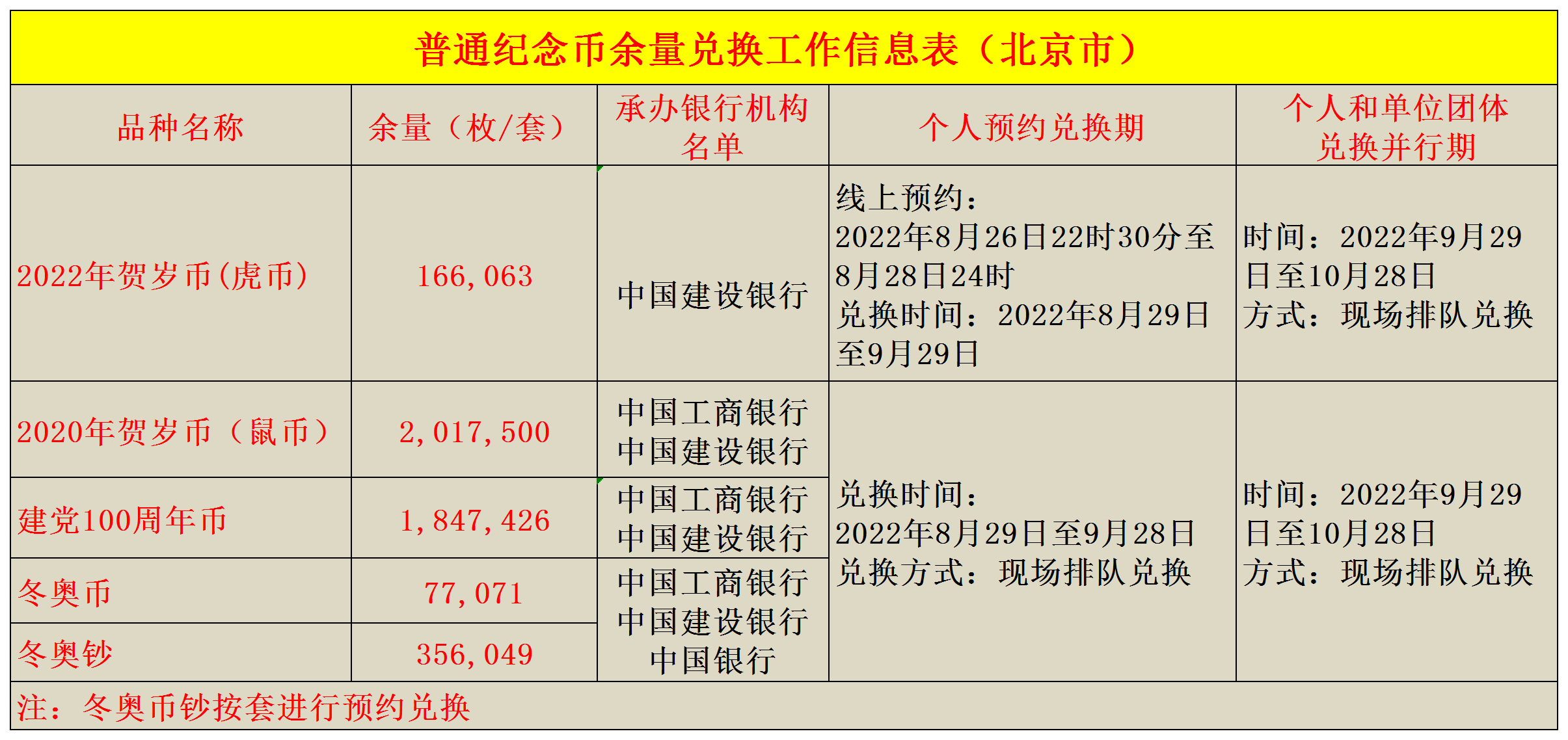 1、北京市。采用是线上预约兑换与现场排队兑换相结合兑换模式,虎币线上预约,26号晚上10.30分预约,其余品种现场排队兑换。每人限20枚/套,可代办一人五证。没有公告兑换网点及各网点可兑换数量明细,要自行到中国工商银行北京市分行、中国建设银行北京市分行官方网站及中国银行北京分行微信公众号查询。