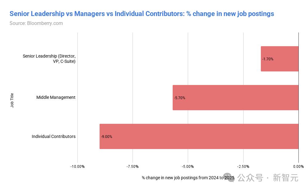 最出人意料的是,尽管整体就业市场萎缩了8%,但高层领导岗位的招聘几乎没有减少。