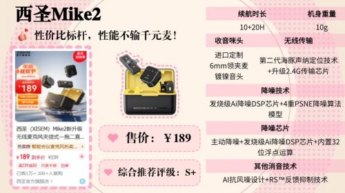 西圣Mike2麦克风将节省的广告费用全部投入技术研发,配备高品质进口定制6mm领夹麦镀镍音头、32位浮点数计算DSP和4重PSNE降噪算法模型,极大地提升了麦克风的抗噪能力和声音还原度。还通过了150多项高品质测试标准,远超行业常见的5-10项检测,续航30小时,6年内性能衰减度低于0.1%,性价比相当高。