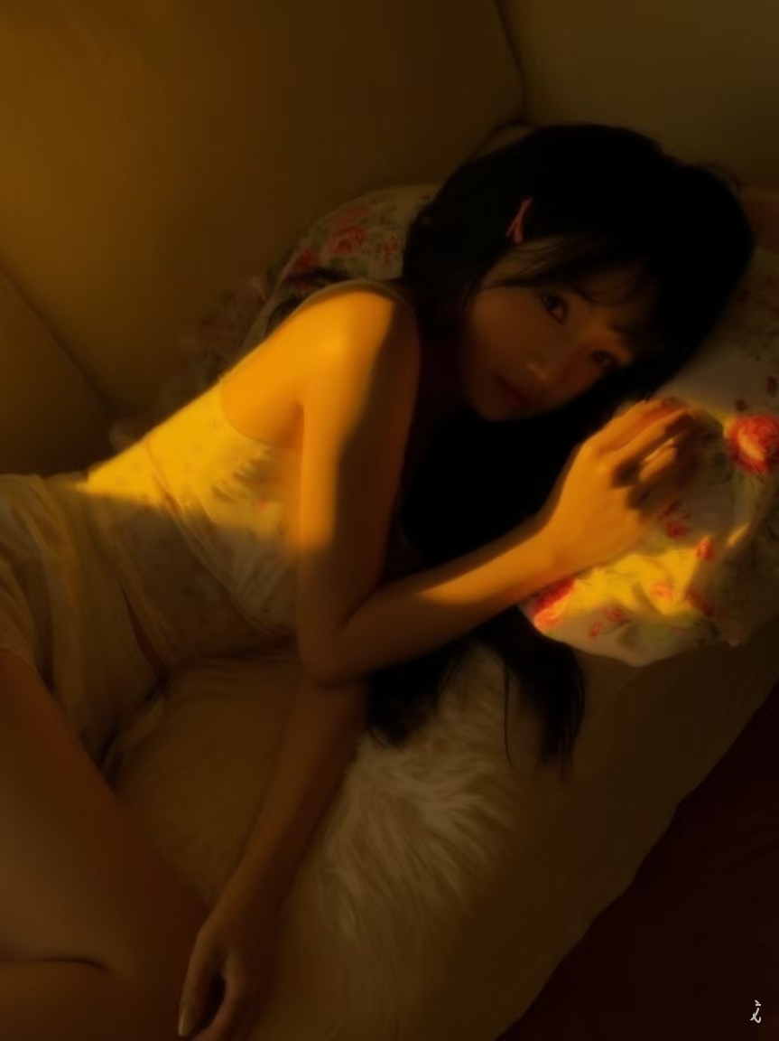 女友穿着性感的碎花吊带,拿着跟长长的黑发,靠在碎花枕头上,看的入神,竟然没发现我进来。