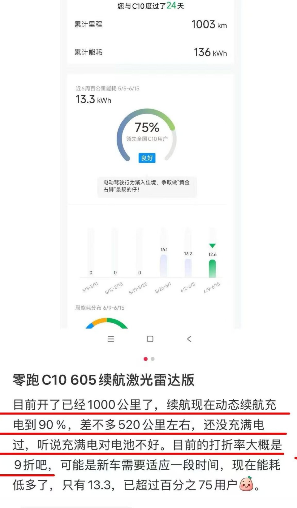 要知道续航作为消费者购车重点看的一项,也是各大新势力品牌集中研发的点,从目前主流新能源车的纯电车续航达成率来看,普遍都在75%—85%左右,而从一位广东的车主发帖来看,他提车已经跑了1000Km了,日常使用这款车续航达成率能够达到90%,这个表现在主流纯电车里面,也是很优秀的成绩单。