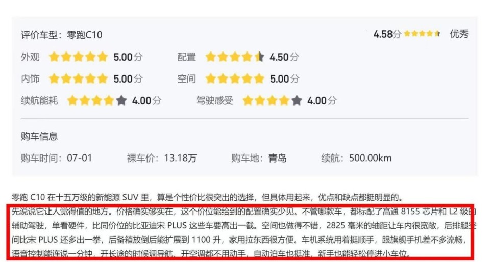 从一位山东青岛的新车主的反馈来看,他对于零跑C10的智能化和配置可以说是非常满意的,他表示:零跑 C10 在十五万级的新能源 SUV 里,算是性价比很突出的选择,不管哪款车,都标配了高通 8155 芯片和 L2 级的辅助驾驶,单看硬件比同价位的比亚迪宋 PLUS 这些车要高出一截,车机系统也用着顺手,跟旗舰手机差不多流畅,语音控制能连说一分钟,开长途的时候调导航、开空调都不用动手,自动泊车也挺准,新手也能轻松停进小车位。