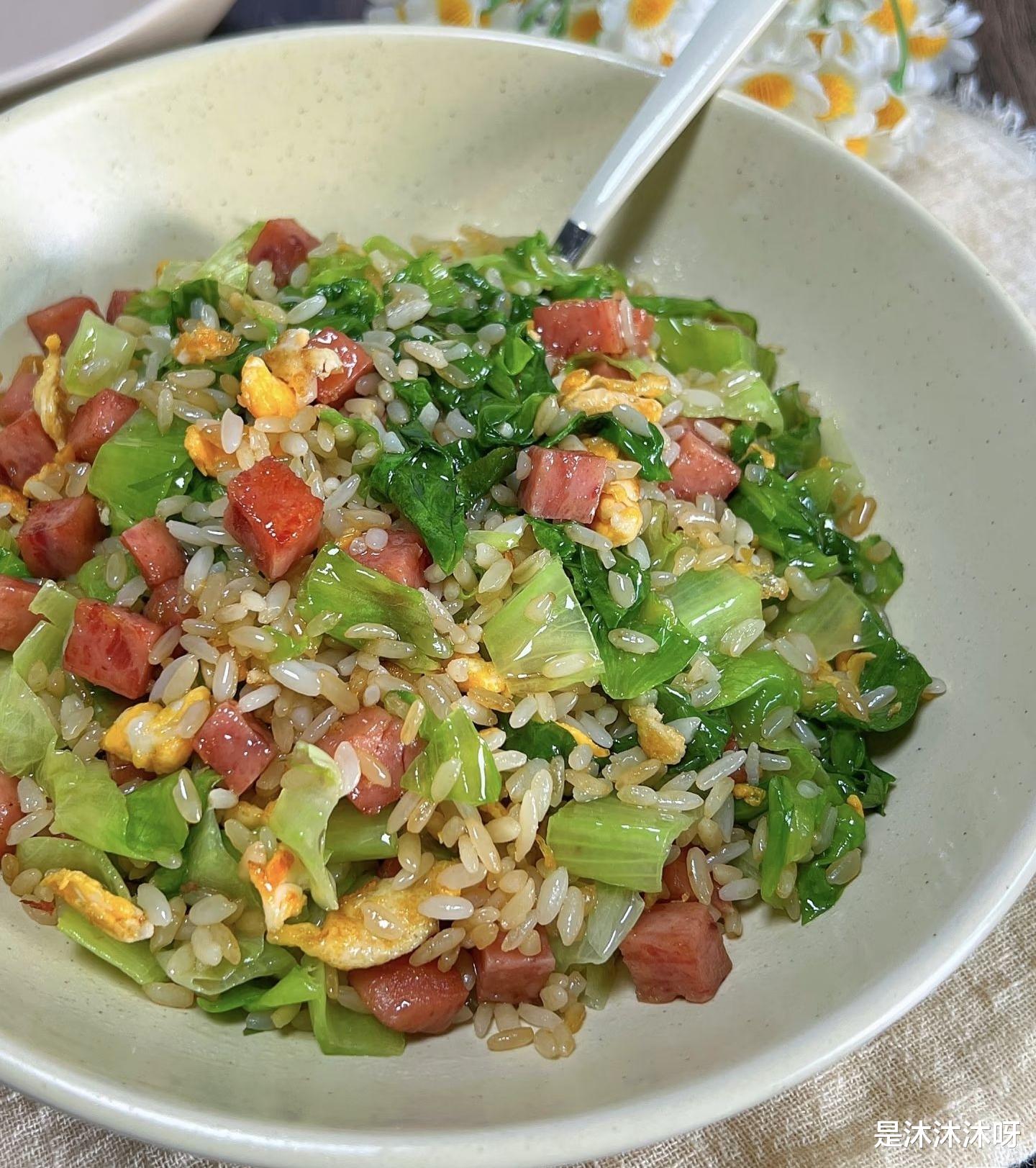 这是一道非常家常、快手又美味的生菜午餐肉鸡蛋烩饭。碗中的米饭粒粒分明,混合着翠绿的生菜、金黄的鸡蛋碎和粉红的午餐肉丁,看起来非常有食欲。