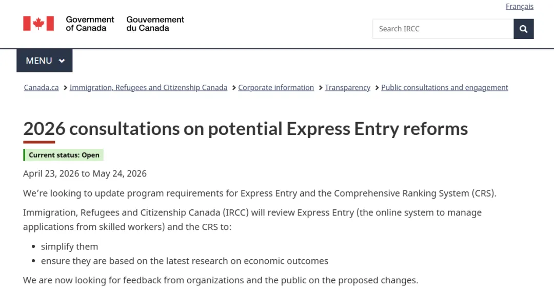 当地时间4月23日,加拿大移民、难民和公民事务部(IRCC)正式发布公告,就快速通道(Express Entry,简称EE)系统的重大改革启动公众意见征集。征求意见期从即日起持续至2026年5月24日。