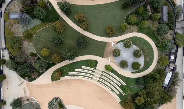 博物馆从地面缓缓升起,仿佛漂浮在抬升的绿意之上,下方是坚实的混凝土基座,将花园从街道层面托起,营造出轻盈而梦幻的视觉效果。