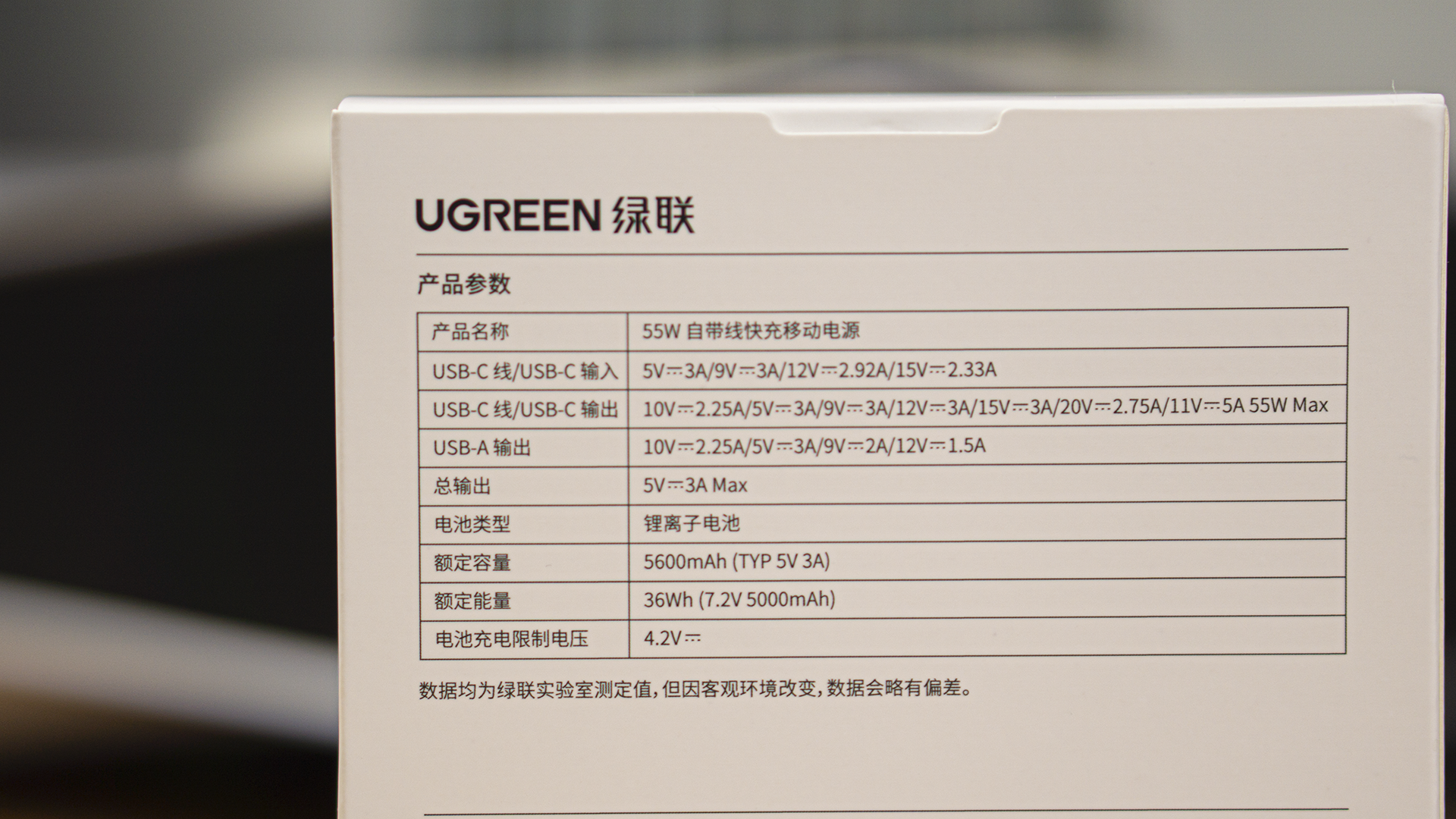 我们先来看开箱吧,这是绿联能量湃 Pro 55W充电宝的外箱,中间是产品图。左侧则标明了它的55W单口最高输出、支持PD45W快充、使用了车规级的电芯及可上高铁和飞机等特征。