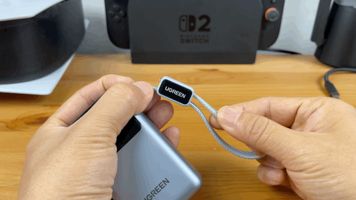 通过把TYPE-C头卡在线夹里面,它就会形成一个闭环。向上一推打开它,就会形成一根充电线。即便是出门忘记带线,只要拿上了绿联能量湃 Pro 55W充电宝,我们也是补电无忧的。
