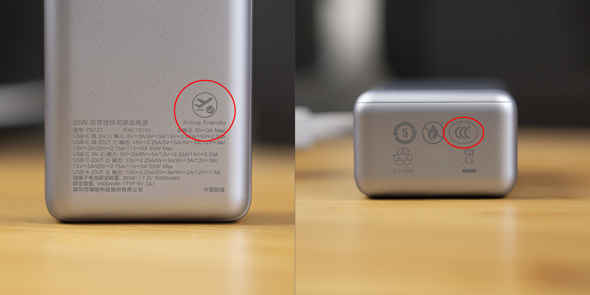 在充电宝的背面,最显眼的就是Airline Friendly的标志。在底部还可以看到CCC的强制认证标志。有了它们,我们不论是高铁还是飞机,都多了一份安心。