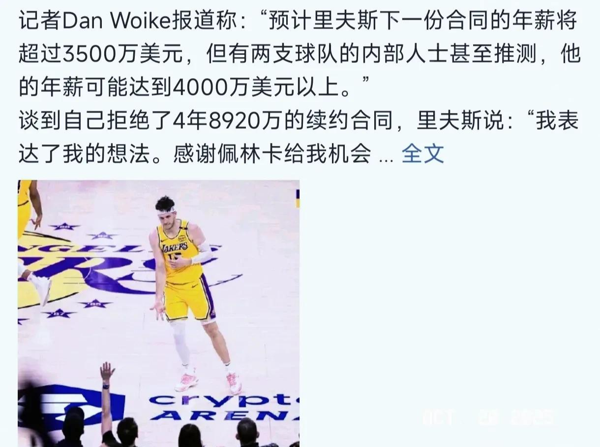 但最终给里弗斯多少薪资,还得看湖人管理层的决策。正常情况下,不应给里弗斯超3000万的年薪。然而,从以往来看,湖人管理层想法独特,球迷建议的球员他们往往不考虑,常做出出人意料的选择。所以,届时湖人管理层给里弗斯4000万年薪也不足为奇。
