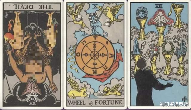 牌:恶魔- 命运之轮+ 圣杯七+