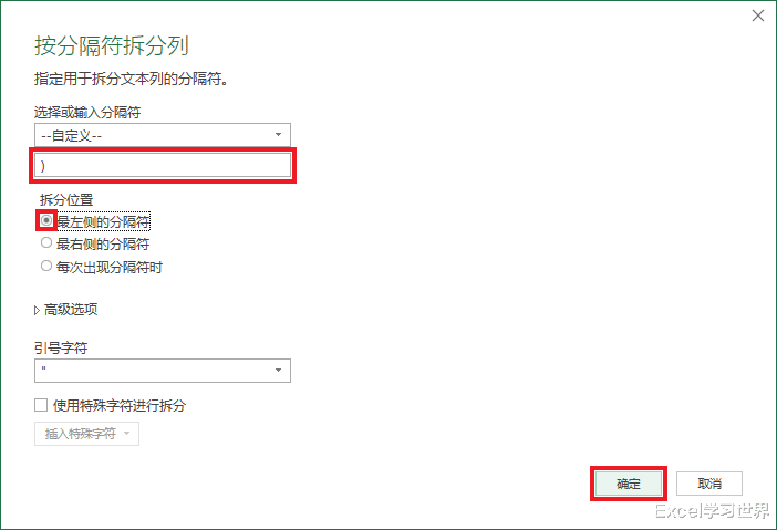 3. 在文本框中输入“(”--> 选择“最左侧的分隔符”--> 点击“确定”