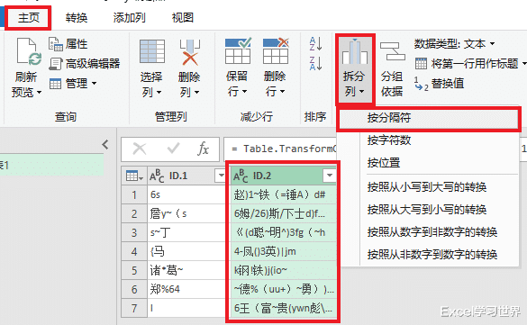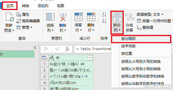 2. 选择任务栏的“主页”-->“拆分列”-->“按分隔符”