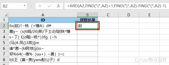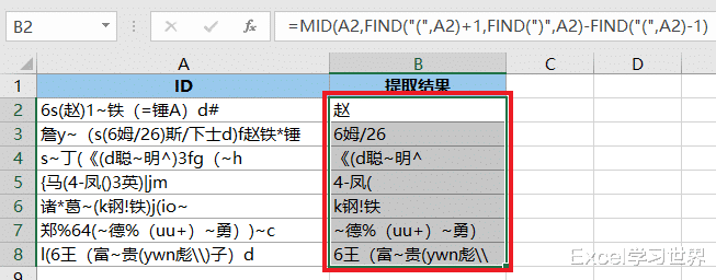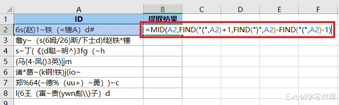 FIND("(",A2)+1:从 A2 单元格中找出第一个“(”所在的位置,将它 +1,作为要提取的第一个字符所在的位置;