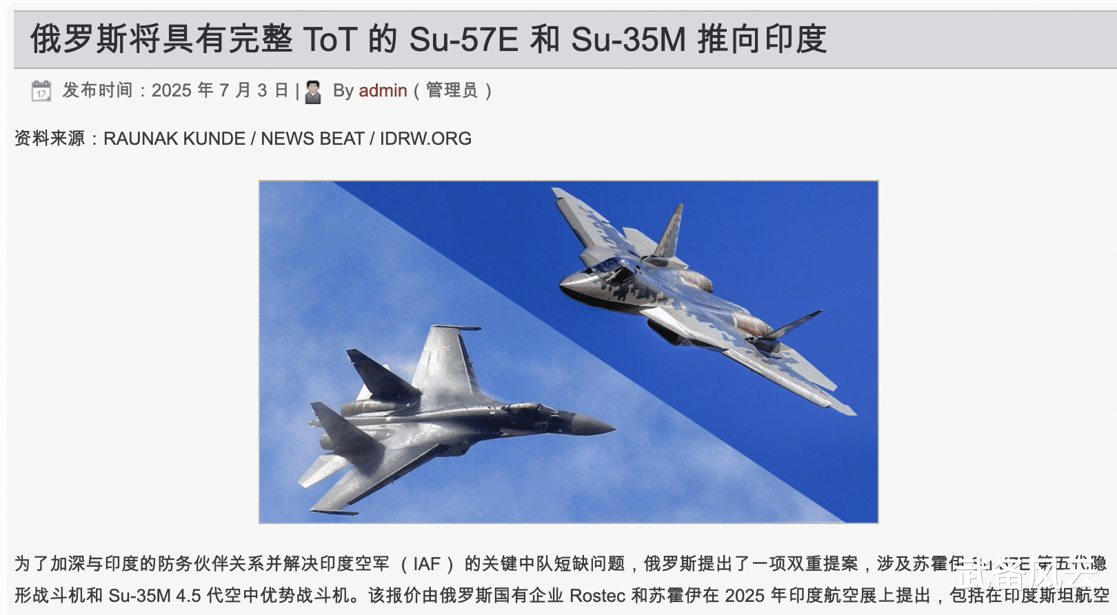 印度做梦都想装备五代隐身战机,现在,俄罗斯就建议印度买他们的五代机苏-57E,据印媒《印度防务观察鹰》日前的报道称,俄罗斯向印度提交了一个方案,来帮助印度快速获得隐身战机,并解决印度空军目前所面临的战斗机短缺,仅装备了31个战斗机中队,迟迟无法满足装备42个中队的问题。