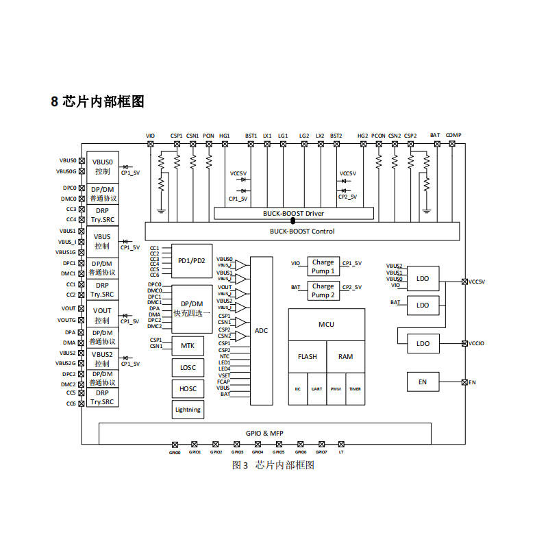 此外,该芯片还配备了32位MCU,具有6K RAM和128K FLASH,最多支持19路GPIO功能,其中5路GPIO具备ADC功能,并支持两路独立的I2C,主从机可选。MCU及接口资源为开发者提供了设计灵活性,可满足多种应用需求。