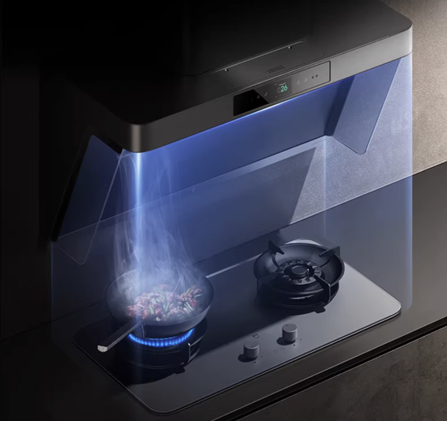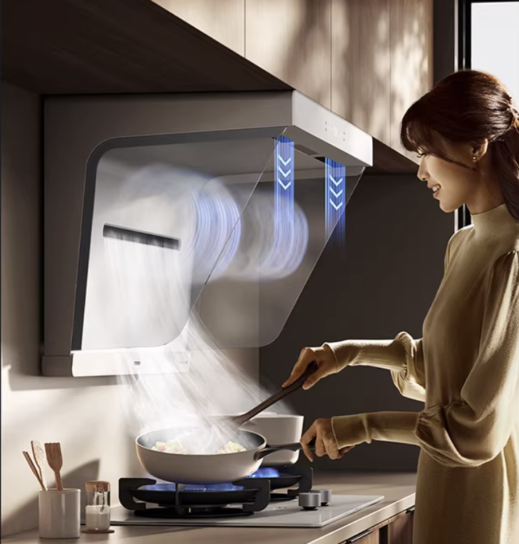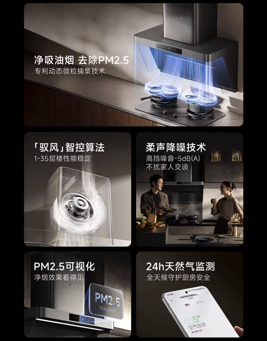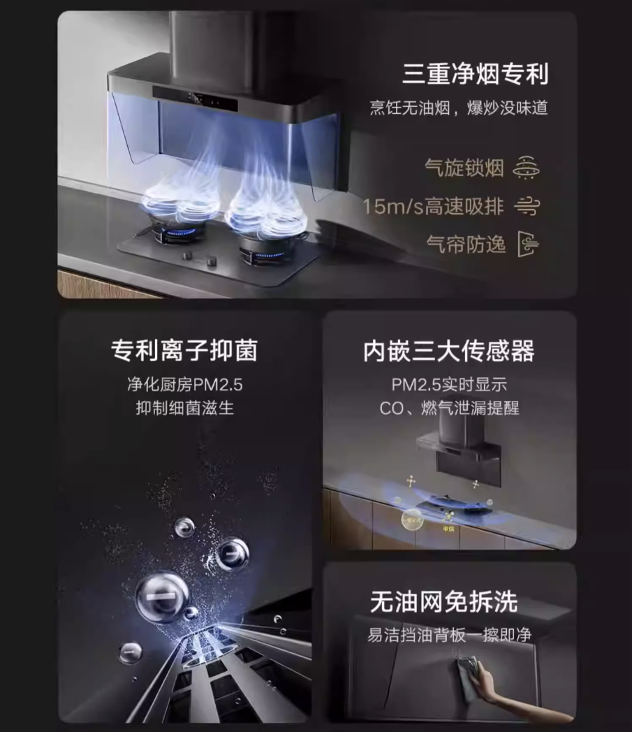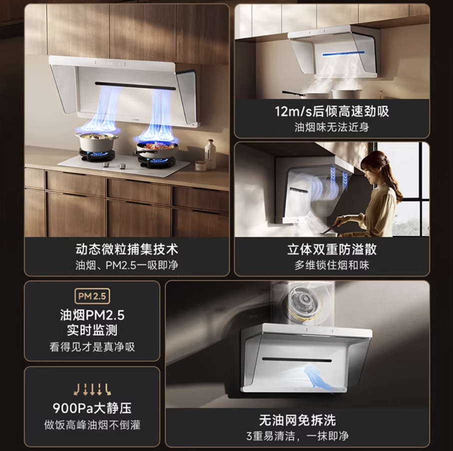 核心参数:动态微粒捕集技术,无油网设计,支持24小时燃气监测、PM2.5实时监测、联动关阀报警,高档运行噪音62-67dB(A),适配开放式厨房。