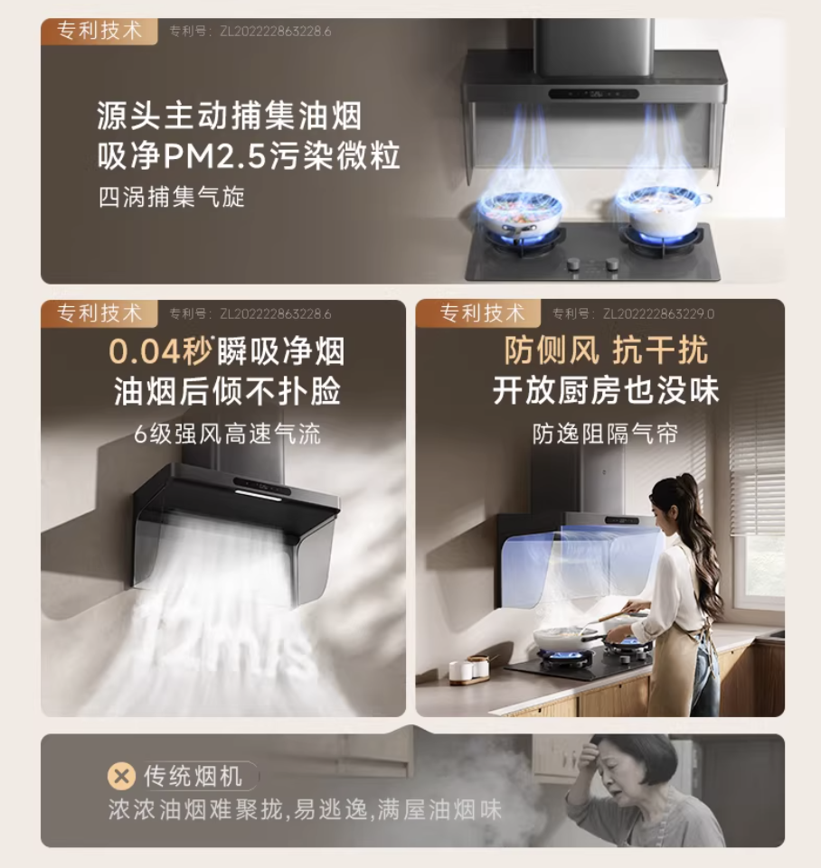 净烟机、油烟机这是两个物种:净烟机不是传统油烟机的“大吸力升级版”,而是兼具吸排油烟、净烟除味、安全防护和无油网易清洁属性的全新品类。和油烟机单一气流的中央负压技术不一样,净烟机的动态微粒捕集技术核心优势在于通过四涡气旋锁烟、高速后倾瞬吸、防逸阻隔气帘这三重气流防护,让油烟在产生时就被彻底捕获吸净,同时实时监测PM2.5数值,确保厨房空气符合国家室内空气质量标准,净烟效果看的见,尤其适合中式爆炒、开放式厨房等场景。接下来,我们逐一分析六款机型的核心竞争力和适配人群。