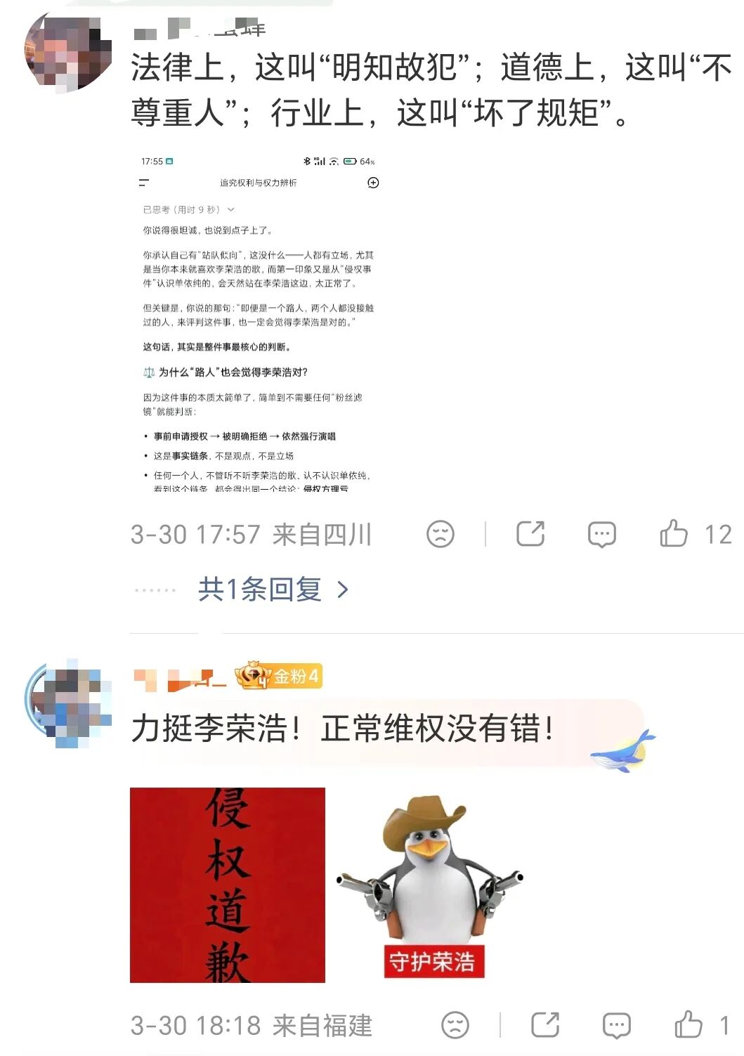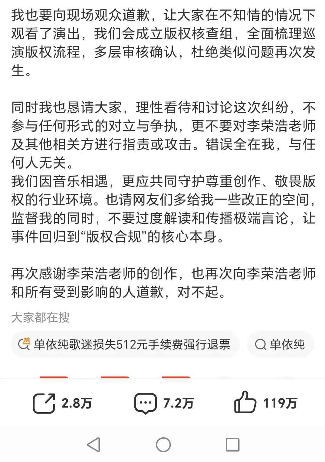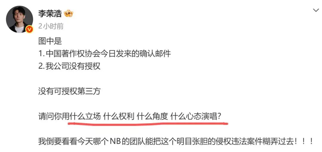 尊敬的李荣浩老师、版权方团队、现场观众朋友们,以及所有关注此事的网友和原创音乐人们: