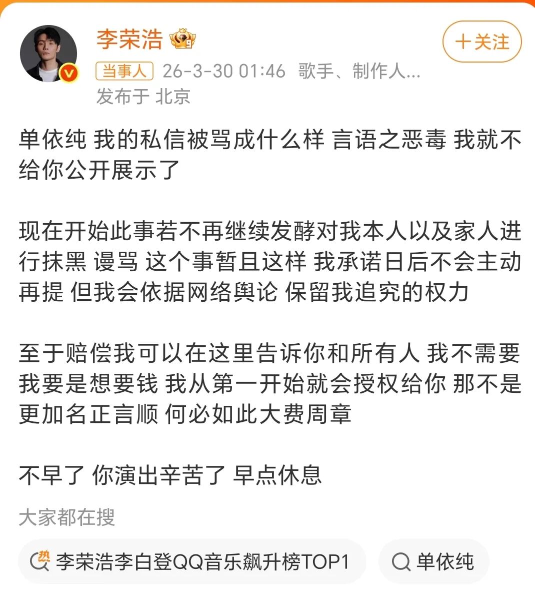同时我也恳请大家,理性看待和讨论这次纠纷,不参与任何形式的对立与争执,更不要对李荣浩老师及其他相关方进行指责或攻击。错误全在我,与任何人无关。