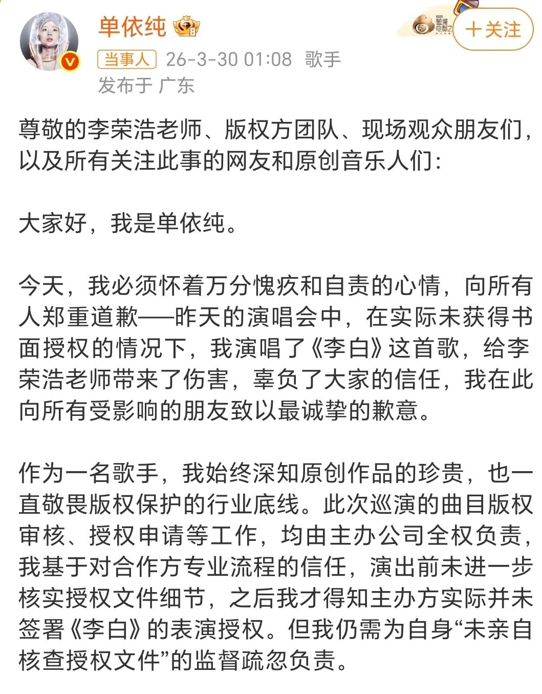 作为一名歌手,我始终深知原创作品的珍贵,也一直敬畏版权保护的行业底线。此次巡演的曲目版权审核、授权申请等工作,均由主办公司全权负责,我基于对合作方专业流程的信任,演出前未进一步核实授权文件细节,之后我才得知主办方实际并未签署《李白》的表演授权。但我仍需为自身“未亲自核查授权文件”的监督疏忽负责。
