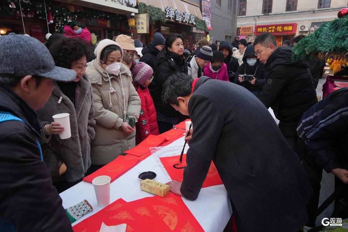 活动现场好戏连台,非遗元素贯穿全程。文艺演出中,舞狮、民乐、戏曲、曲艺等传统节目轮番上演,为古老街巷注入节庆活力;“墨香迎春·福至万家”写福送福活动中,书法家挥毫泼墨,将承载新春祝福的“福”字、春联送到市民手中;特别设置的“非遗糖水铺”免费赠饮周氏艾灸养生汤,为冬日逛集群众送上暖意。