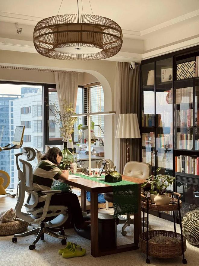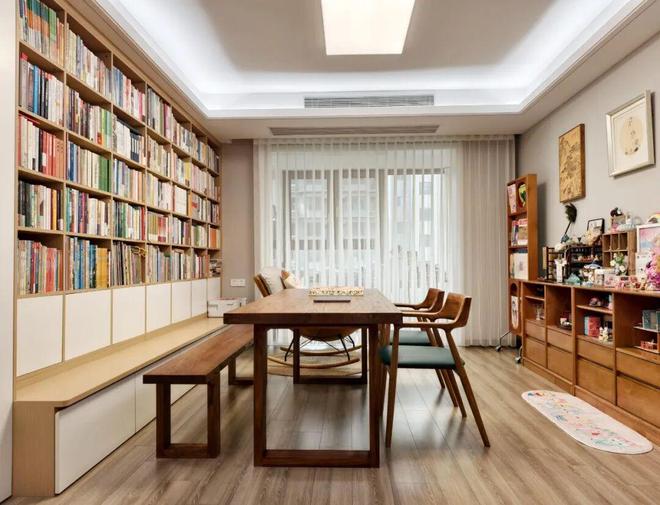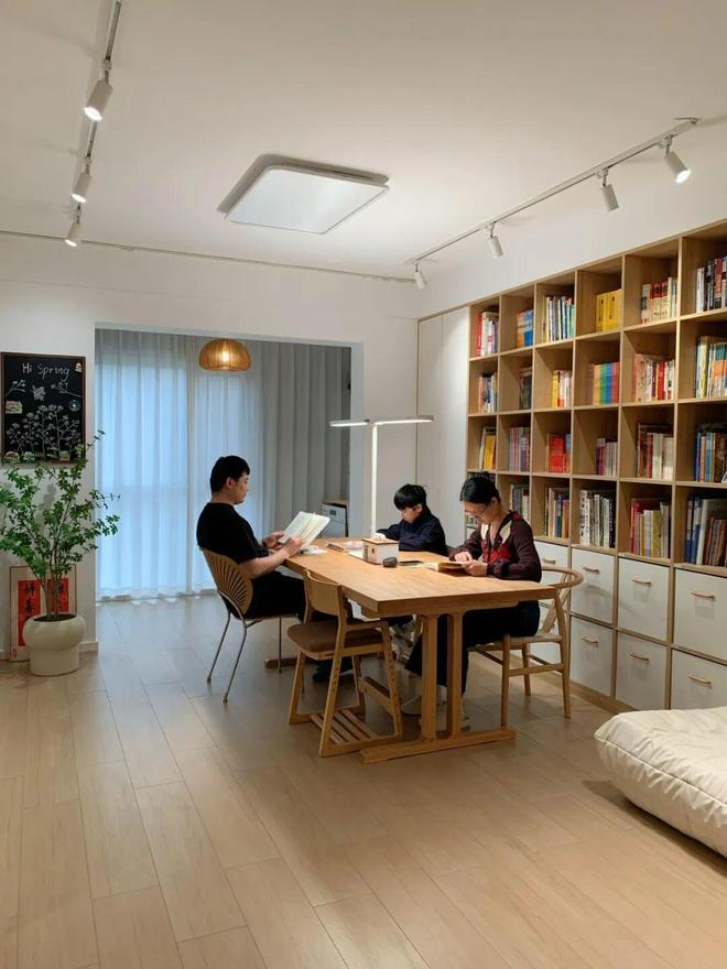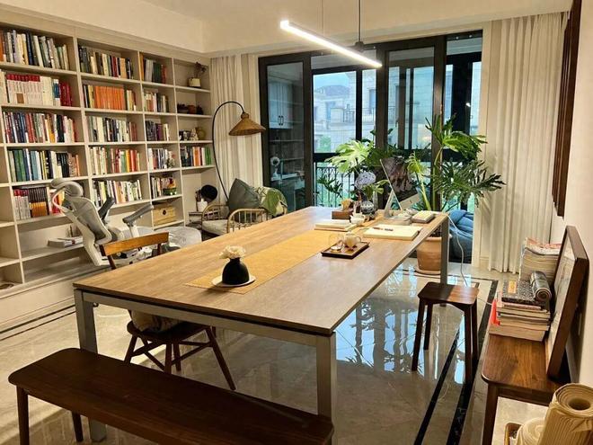 不过相较于居家办公,注重学习氛围的家庭,其实更适合将大长桌放客厅里。一来方便大人观看孩子,二来方便从小培养孩子的专注力和自主学习的习惯。