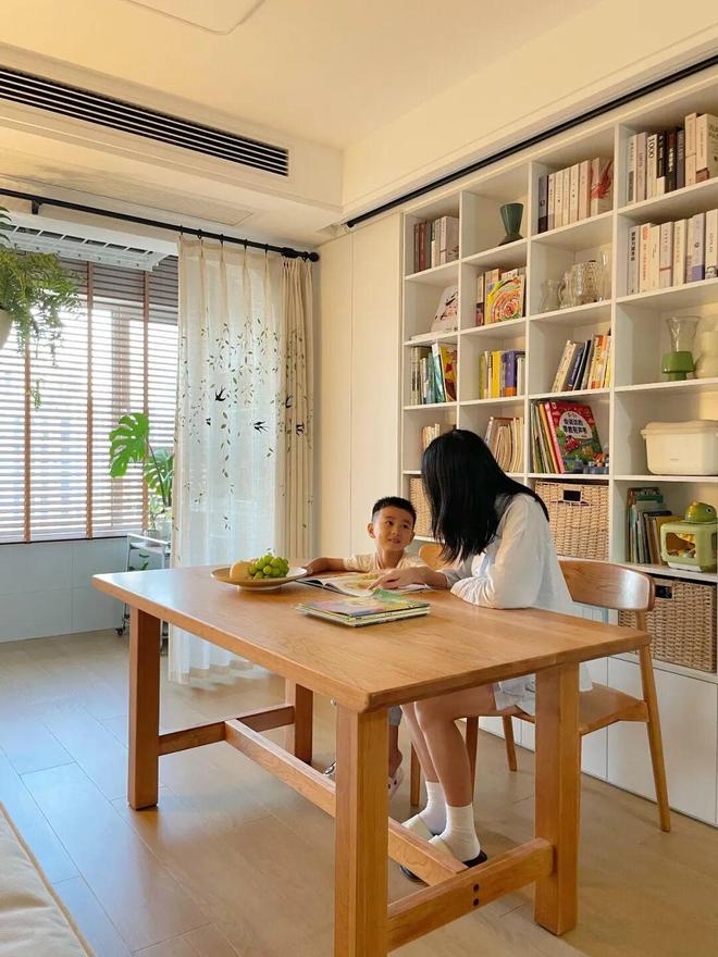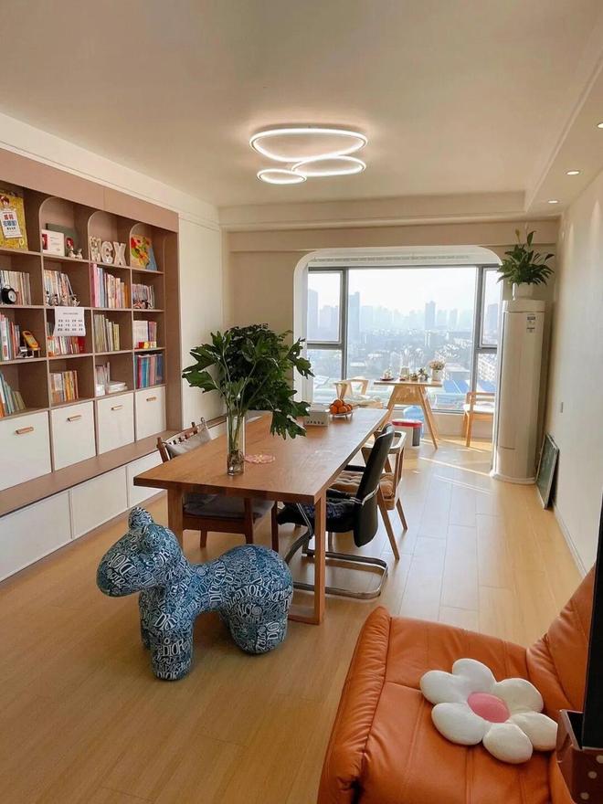 我是把餐桌搬进了客厅里,平时带孩子做手工、阅读,或者自己处理一些工作都很方便,感觉这样布置后,客厅都成了家里的一块“宝藏空间”,非常喜欢。