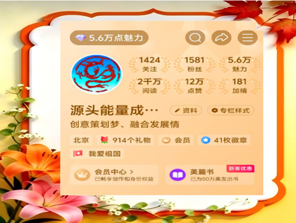 在蒋老师的支持下,我成立了“源头能量成长营”,开通了自媒体账号,撰写文章,进行直播。现在,我的美篇已经有两千万的阅读量了,学习蒋老师培养弟子兵,目前“源头能量成长营”也有了第二、三代传承人了,培养《新时代的中国青年》关心儿童成长,也是我们70后责任与担当。