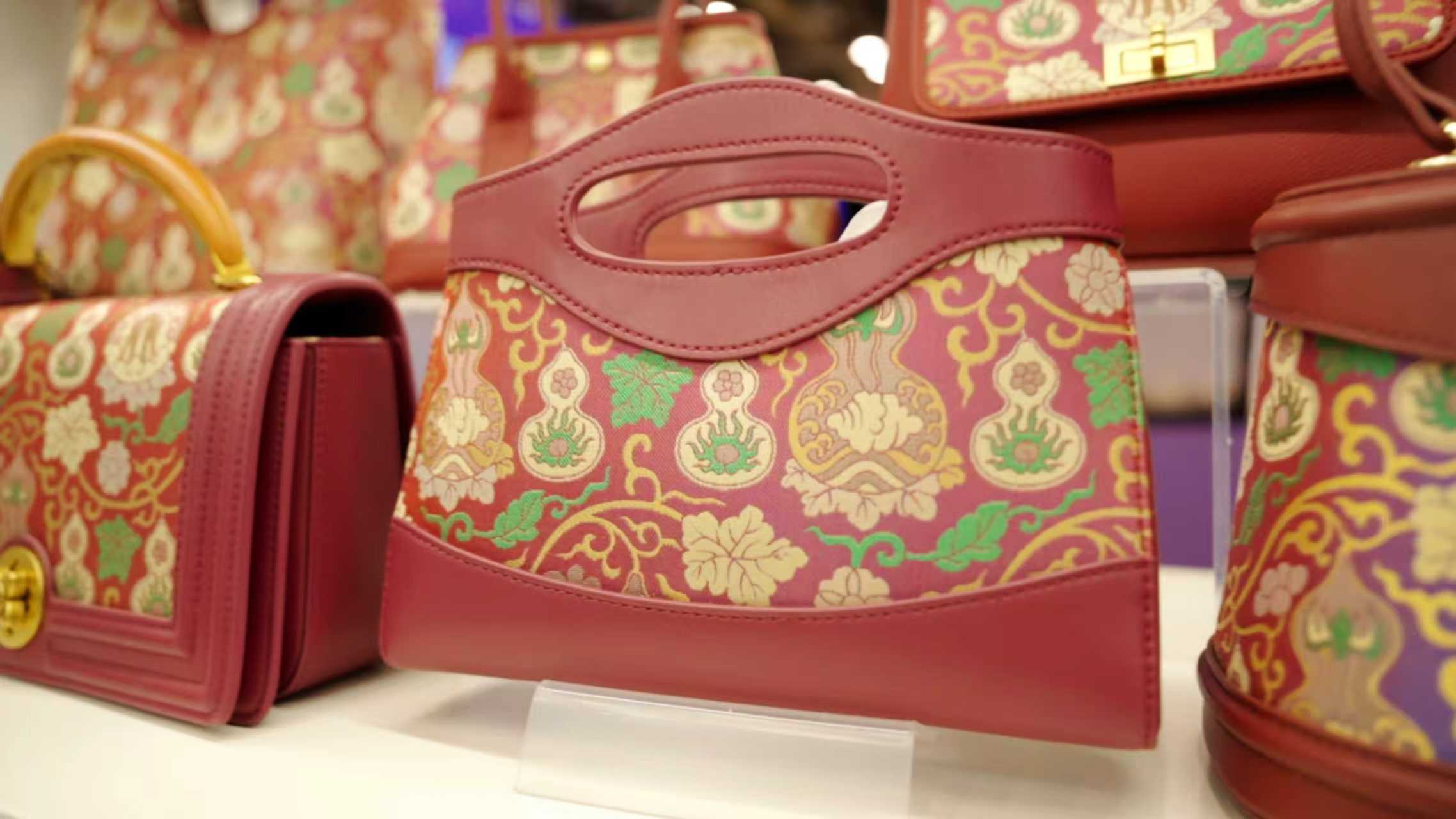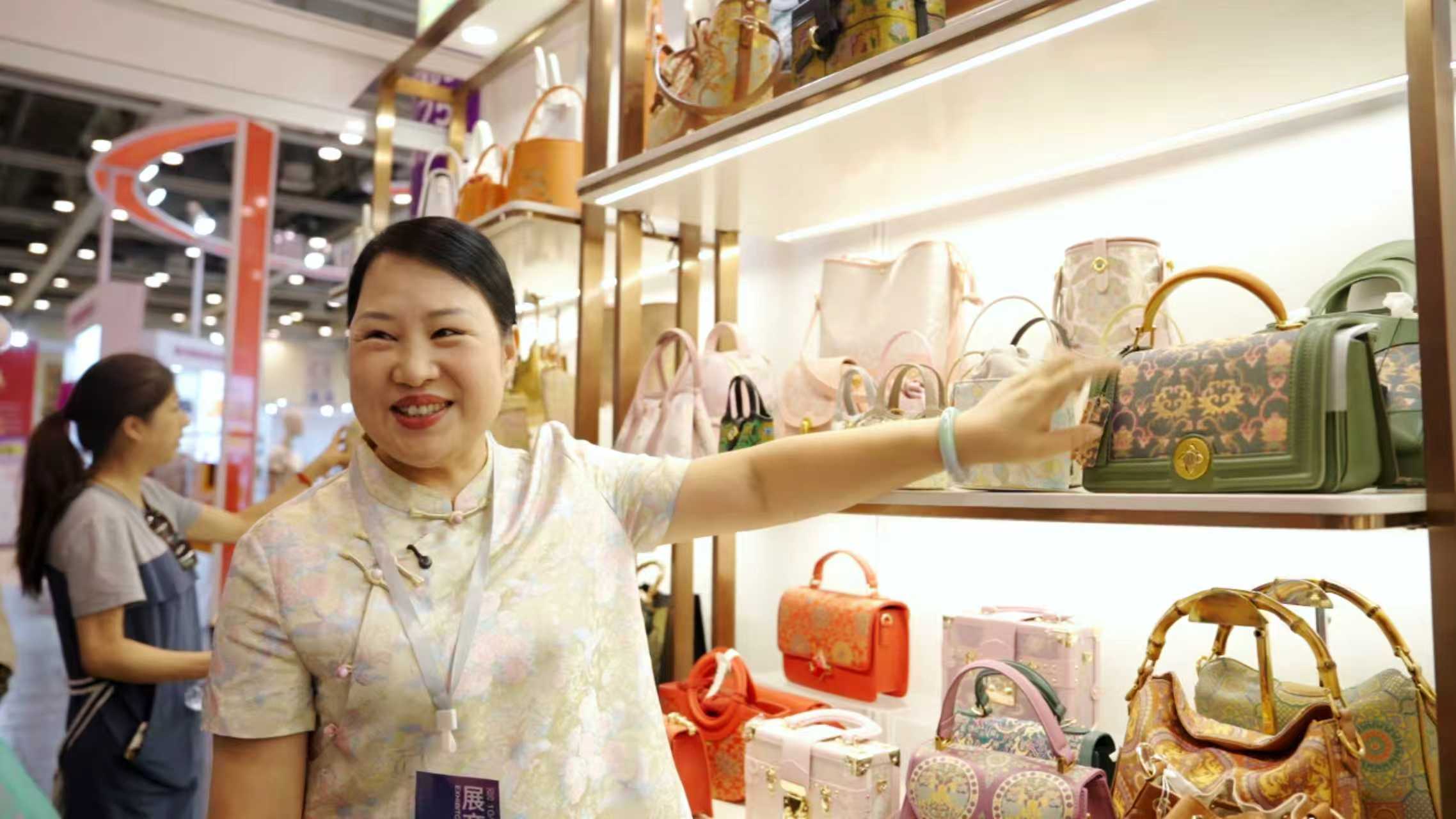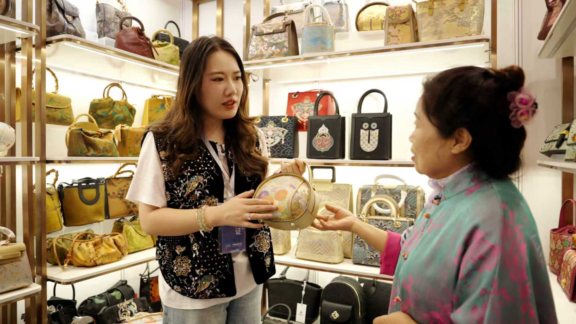 临近中午,人流稍缓,小涵爸爸才拿起水杯喝了一口。同事递来纸巾,他却摆摆手,目光落在展台上那些被阳光镀了层金边的包包上——宋锦的织金泛着柔光,香云纱的肌理藏着时光的温度,每一只包都像在诉说着“把文化缝进细节里”的匠心。她轻轻抚平一只包袋上的褶皱,动作温柔得像在呵护一件珍宝。