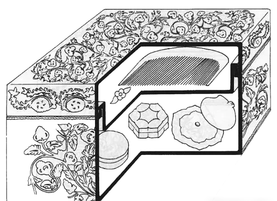 银箔平脱方漆盒,器盖与器身以子母口扣合,通高12、长宽皆21厘米。器表饰银箔平脱纹样,上剔刻出缠枝花卉图案,纹饰细密华丽。内部物品分层存放,上层加一木屉,屉内装有木梳、粉盒、小鎏金铜镜等。如此精美贵重的梳妆盒,也应是李景由沾了出自氏族卢氏妻子的光。