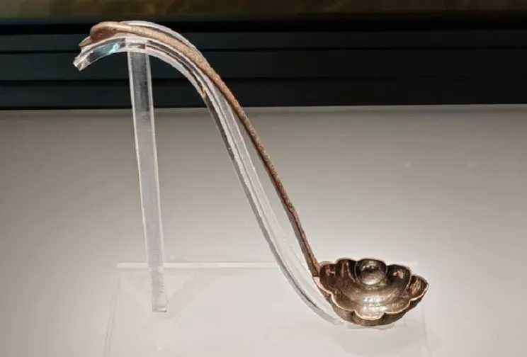 鎏金錾花九曲银勺,勺柄扁方修长,弯柄的末端做成凫头形;勺呈九曲花瓣状,器表錾刻尖瓣宝相花及雀绕花枝图案,蔓枝回转绚丽,结构细密流畅,鎏金工艺精湛;勺的内壁打磨抛光,明亮照人。精美的食器,是不是承托李景由郁闷官场之外对美好生活的向往呢?