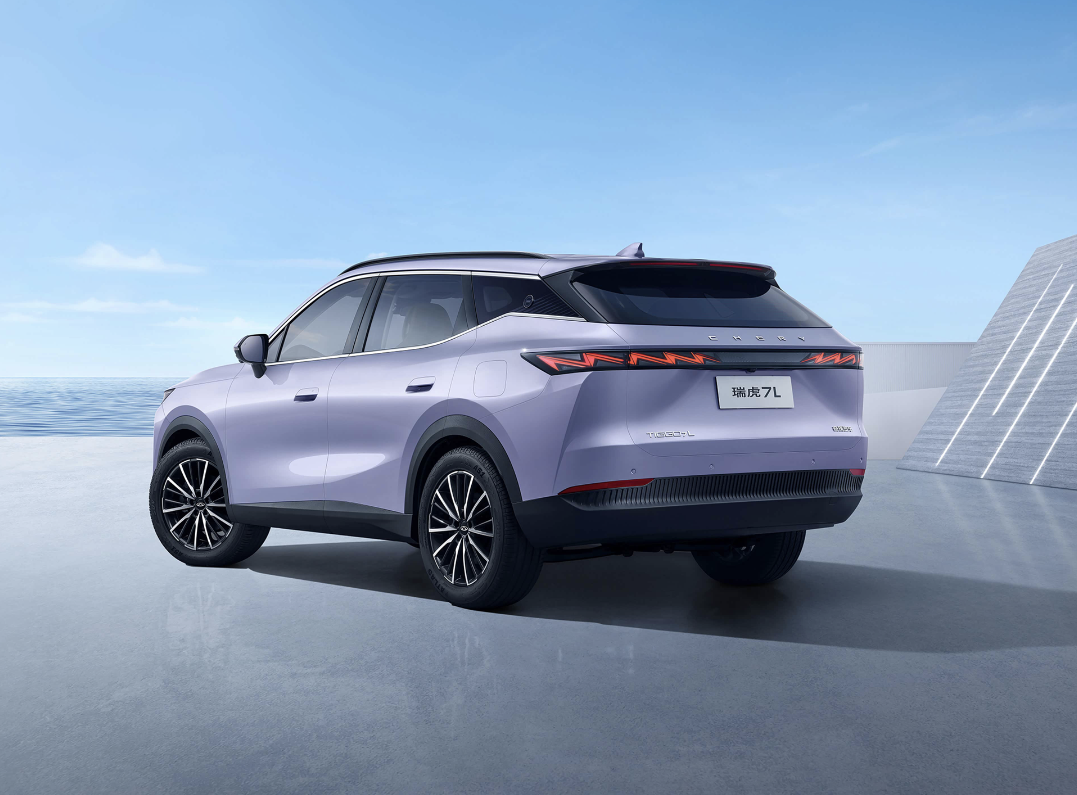 全新瑞虎7L的车身采用了轿跑SUV的经典设计,倾斜角度更大的A柱与溜背式的车顶一气呵成,车顶加入了黑色的行李架,车窗四周加入了银色的镀铬装饰条,黑色的B柱/C柱/D柱与黑色隐私玻璃结合在一起,打造出了半悬浮式车顶的立体视觉效果。四个车门把手采用了半隐藏式设计。黑色的拱形轮眉、黑色的侧裙以及前后黑色的防撞梁形成一体式结构。配备了19英寸的风暴轮毂,匹配了235/50 R19规格的轮胎,再加上银色的刹车盘和红色的刹车卡钳,也营造出不错的运动感。尺寸方面,新车的长宽高分别为4655/1880/1690mm,轴距为2720mm。