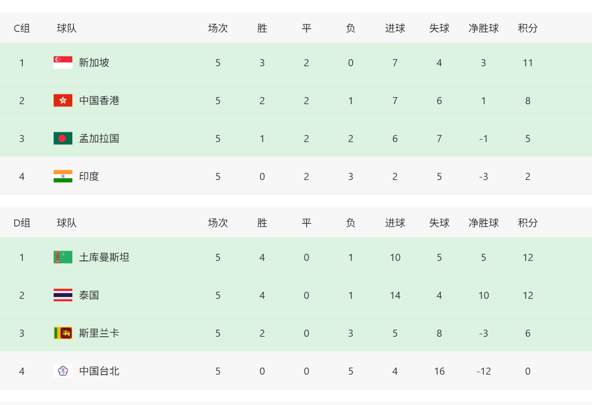 D组的泰国4-0斯里兰卡,土库曼斯坦3-1中国台北,泰国与土库曼斯坦都是4胜1负积12分,末轮正面对决,首回合泰国曾1-3不敌土库曼。6分的斯里兰卡与五连败的中国台北则已经出局。