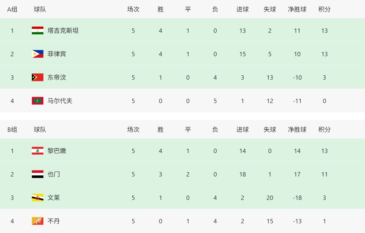在其余比赛里,A组比赛没有意外,塔吉克斯坦5-0东帝汶,菲律宾2-0马尔代夫,五轮之后塔吉克斯坦与菲律宾都是4胜1平积13分,末轮直接交手,双方首回合战平,导致末轮的胜者将直接晋级,如果打平,塔吉克斯坦将以1个净胜球的优势力压对手晋级,因此菲律宾只有赢球一条路。东帝汶3 分,马尔代夫0分双双出局