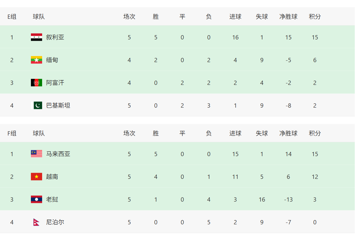 E组的黎巴嫩3-0文莱斩获五连胜,黎巴嫩在第四轮结束后就已经出线,目前积15分,巴基斯坦0分垫底,而阿富汗与缅甸的比赛因特殊情况,延期到明年3月26号进行。