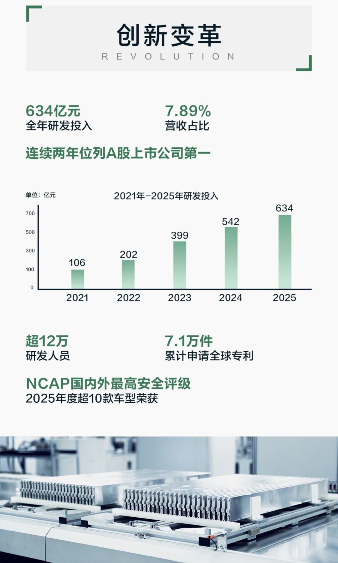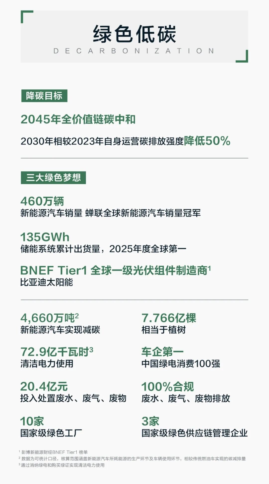 2025年卖出460万辆新能源车,全球第一;储能系统累计出货量突破135GWh,全球第一;清洁电力使用72.9亿千瓦时,中国车企中排名第一。