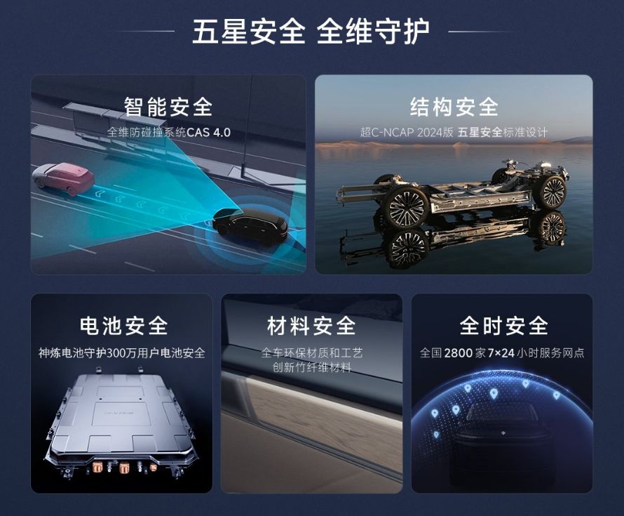 智能安全方面,华为乾崑智驾与CAS4.0防碰撞系统协同,构建实时风险预警机制;结构安全则拥有超C-NCAP 2024五星标准车身结构;电池安全,通过守护300万用户的神炼电池,配合全球首创半固态技术可实现1000km续航;材料安全创新,“以竹代塑”工艺与空气净化系统悉数上车;全时安全则包括2800家服务网点构建7×24小时救援网络。